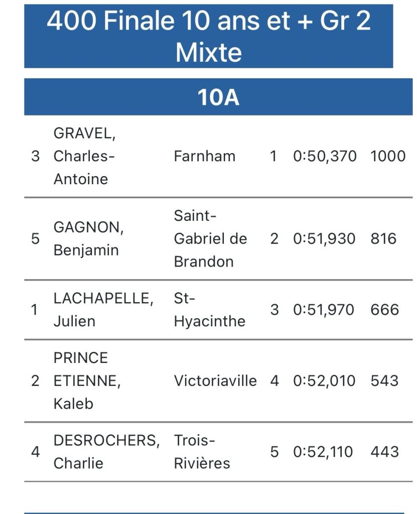 Par ailleurs, la performance du jour est revenue à Oïlhan Mercier-Annecou chez les 10 ans et plus groupe 1. Malgré quelques difficultés lors des qualifications, le patineur de 13 ans a fait une fière démonstration de sa vitesse et a facilement atteint les standards de temps pour monter au niveau Interrégional.